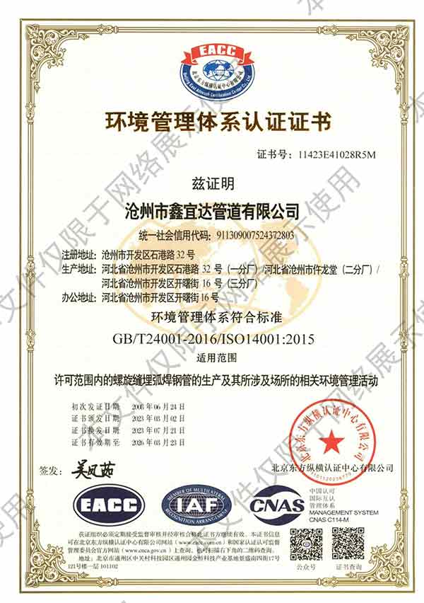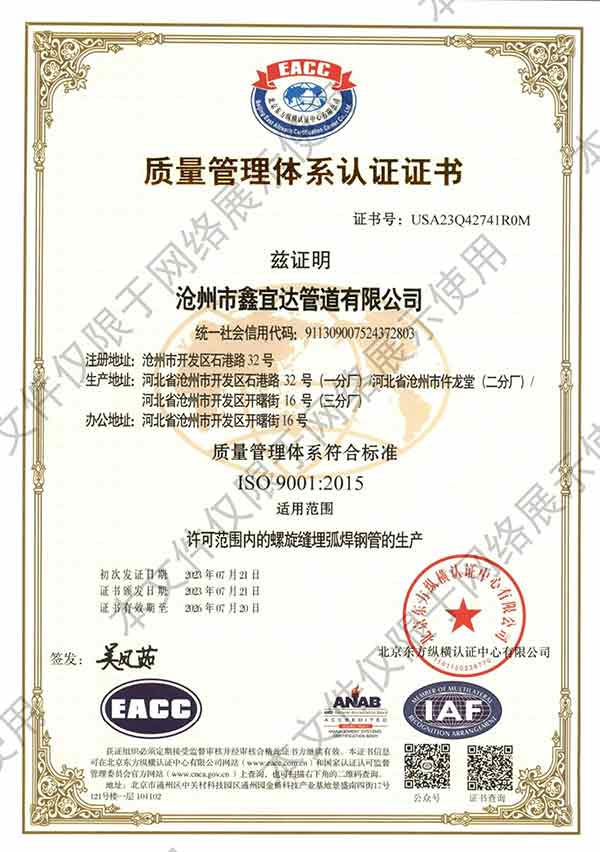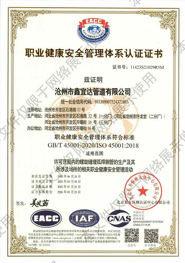 滄州市鑫宜達管道有限公司成立于2003年7月,坐落于滄州經濟開發(fā)區,占地面積40萬平方米,注冊資金1.81億元,是集螺旋鋼管生產、防腐加工以及無縫鋼管、卷板、帶鋼等品類鋼材經營銷售于一體的工貿型企業(yè)。公司現有員工400多人,其中,中高級技術職稱的人員達120余名。 滄州市鑫宜達管道有限公司擁有9條螺旋鋼管生產線和3PE防腐生產線,可生產直徑219--3640mm,壁厚5.5--28mm,最高鋼級X100的各種規(guī)格防腐螺旋鋼管...